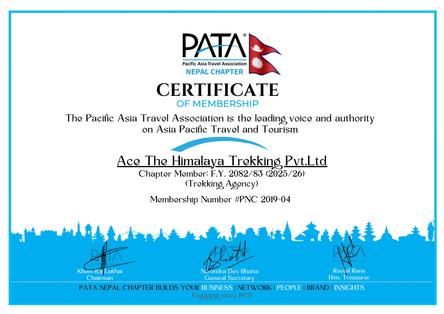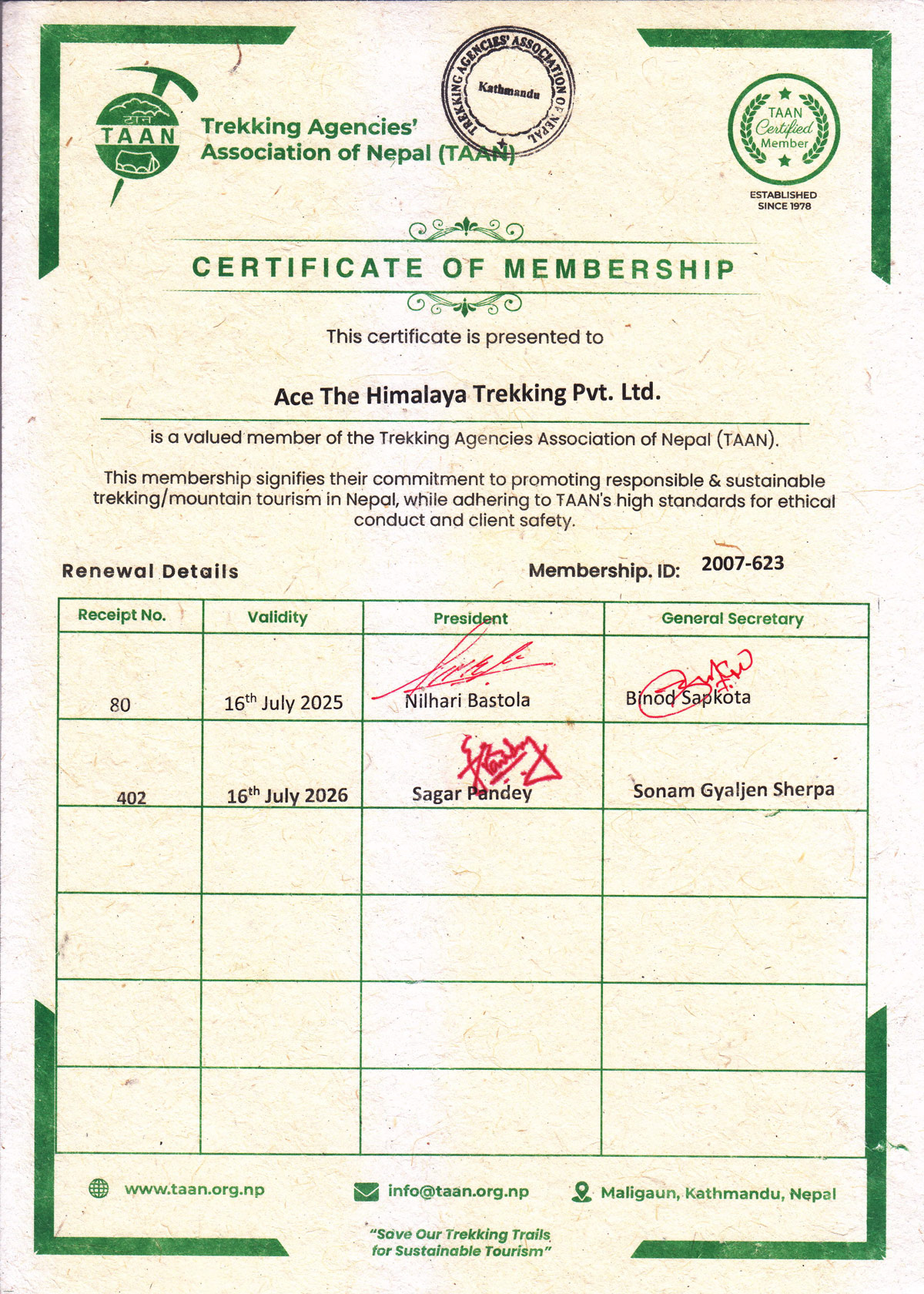 Ace the Himalaya Trekking Pvt. Ltd and Ace the Himalaya Tours and Travels Pvt. Ltd is a well-known government licensed trekking and touring company in Nepal. Please find the details of government licenses and authorities that Ace the Himalaya holds: