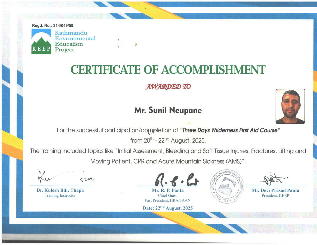 He is licensed from Ministry of Tourism of Nepal and also holds a High Altitude First Aid Certificate.
